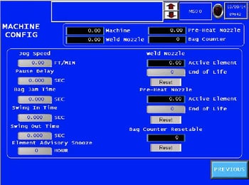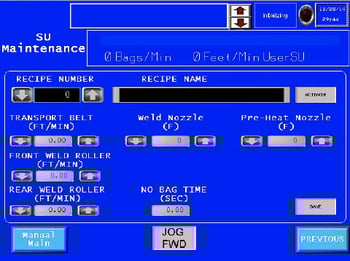 - Tiempo sin bolsa (SEC): El sensor de entrada de bolsa controla cuándo se indica al sistema de giro de la boquilla que esté en la posición de soldadura y cuándo en la posición de inicio cuando la máquina está en modo de funcionamiento. Cuando una bolsa entra en la máquina y el sensor ve la bolsa, se indica al sistema de giro de la boquilla que gire a la posición de soldadura. El número que aparece en el cuadro de texto es la cantidad de tiempo que debe transcurrir sin que pase una bolsa por el sensor de entrada de bolsas. Si se alcanza esta cantidad de tiempo, se le indica al sistema de giro de la tobera que vaya a su posición inicial hasta que se detecte otra bolsa. Al tocar el cuadro de texto en la pantalla aparecerá un teclado que permitirá al usuario cambiar el punto de ajuste.